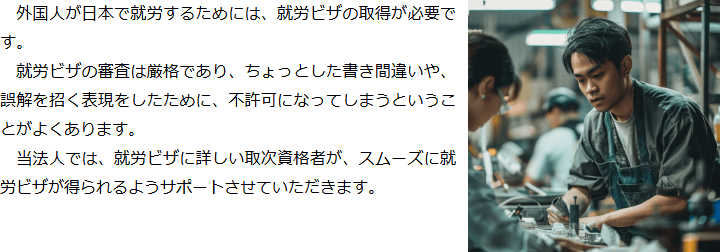 トップビザの種類別サービス内容就労ビザ(その他) 階層構造▼ ビザの種類別サービス内容(目次) 就労ビザ(その他) ビザの種類別サービス内容(目次)ビザの種類別サービス内容トップ特定技能(就労ビザ)技術・人文知識・国際業務(就労ビザ)就労ビザ(その他)経営管理ビザ国際結婚・配偶者ビザ永住権定住者ビザ家族滞在ビザ短期滞在ビザ帰化申請留学ビザ資格外活動許可インターンシップビザ企業内転勤ビザ高度専門職在留特別許可 受付時間 平日 9時~21時、土日祝 9時~18時 夜間・土日祝の相談も対応します (要予約) 所在地 〒060-0808 北海道札幌市北区北八条西4‐1-1パストラルビルN8 2F 0120-41-2403 お問合せ・アクセス・地図