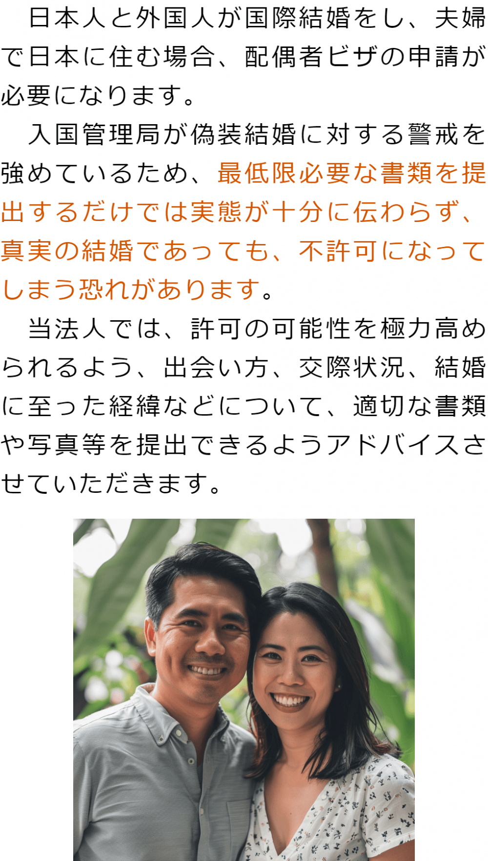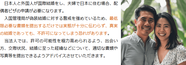 トップビザの種類別サービス内容国際結婚・配偶者ビザ 階層構造▼ ビザの種類別サービス内容(目次) 国際結婚・配偶者ビザ 詳細につきましては、以下のサイトをご覧ください(以下のボタンをクリック)。 ビザの種類別サービス内容(目次)ビザの種類別サービス内容トップ特定技能(就労ビザ)技術・人文知識・国際業務(就労ビザ)就労ビザ(その他)経営管理ビザ国際結婚・配偶者ビザ永住権定住者ビザ家族滞在ビザ短期滞在ビザ帰化申請留学ビザ資格外活動許可インターンシップビザ企業内転勤ビザ高度専門職在留特別許可 受付時間 平日 9時~21時、土日祝 9時~18時 夜間・土日祝の相談も対応します (要予約) 所在地 〒060-0808 北海道札幌市北区北八条西4‐1-1パストラルビルN8 2F 0120-41-2403 お問合せ・アクセス・地図
