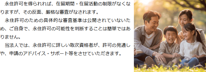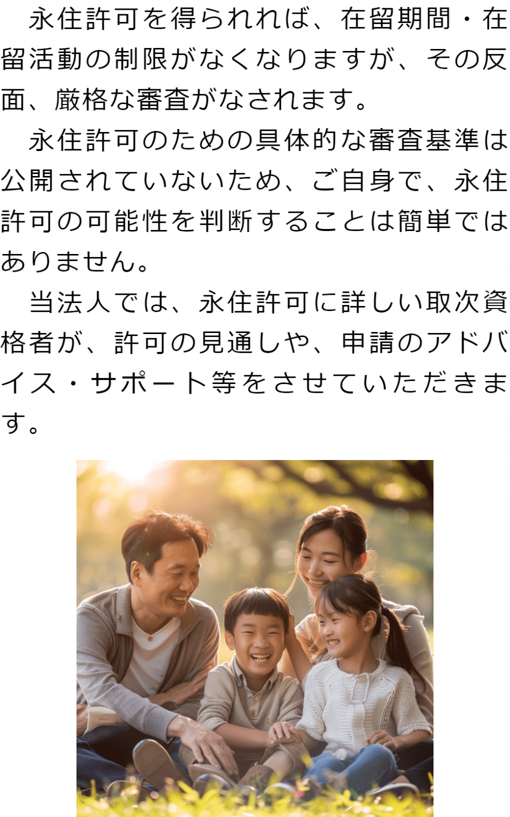 トップビザの種類別サービス内容永住権 階層構造▼ ビザの種類別サービス内容(目次) 永住権 詳細につきましては、以下のサイトをご覧ください(以下のボタンをクリック)。 ビザの種類別サービス内容(目次)ビザの種類別サービス内容トップ特定技能(就労ビザ)技術・人文知識・国際業務(就労ビザ)就労ビザ(その他)経営管理ビザ国際結婚・配偶者ビザ永住権定住者ビザ家族滞在ビザ短期滞在ビザ帰化申請留学ビザ資格外活動許可インターンシップビザ企業内転勤ビザ高度専門職在留特別許可 受付時間 平日 9時~21時、土日祝 9時~18時 夜間・土日祝の相談も対応します (要予約) 所在地 〒060-0808 北海道札幌市北区北八条西4‐1-1パストラルビルN8 2F 0120-41-2403 お問合せ・アクセス・地図