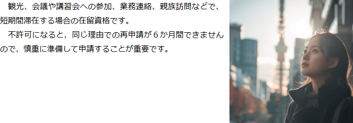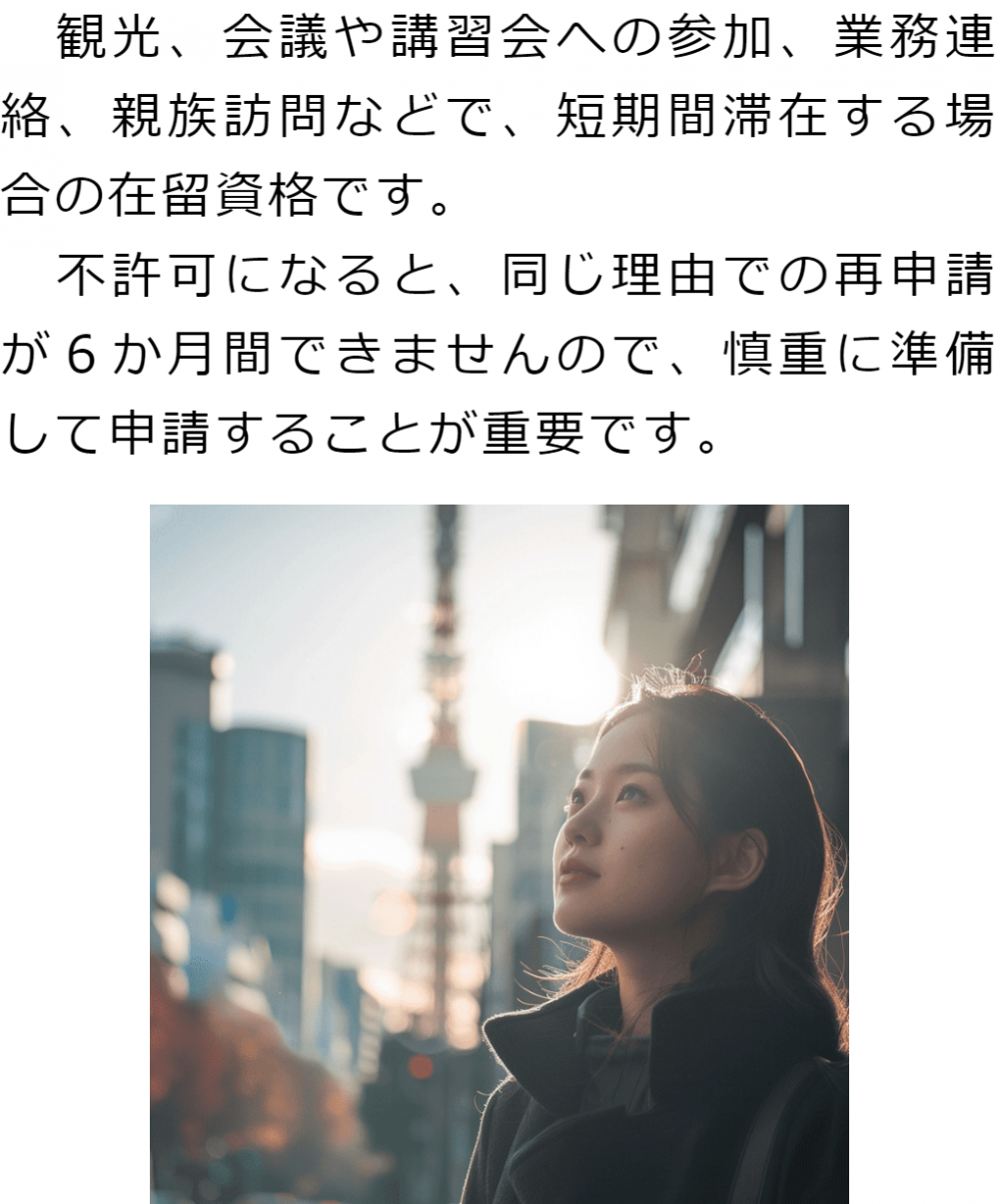 トップビザの種類別サービス内容短期滞在ビザ 階層構造▼ ビザの種類別サービス内容(目次) 短期滞在ビザ ビザの種類別サービス内容(目次)ビザの種類別サービス内容トップ特定技能(就労ビザ)技術・人文知識・国際業務(就労ビザ)就労ビザ(その他)経営管理ビザ国際結婚・配偶者ビザ永住権定住者ビザ家族滞在ビザ短期滞在ビザ帰化申請留学ビザ資格外活動許可インターンシップビザ企業内転勤ビザ高度専門職在留特別許可 受付時間 平日 9時~21時、土日祝 9時~18時 夜間・土日祝の相談も対応します (要予約) 所在地 〒060-0808 北海道札幌市北区北八条西4‐1-1パストラルビルN8 2F 0120-41-2403 お問合せ・アクセス・地図
