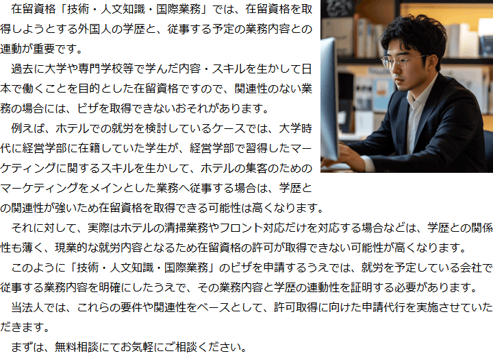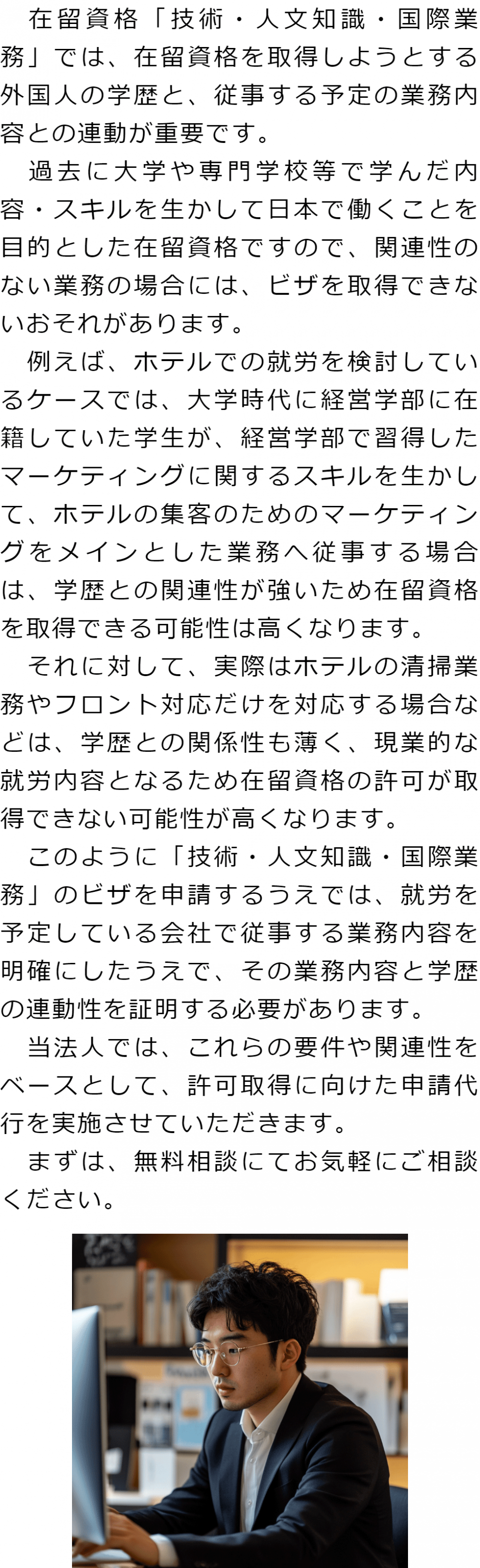 トップビザの種類別サービス内容技術・人文知識・国際業務(就労ビザ) 階層構造▼ ビザの種類別サービス内容(目次) 技術・人文知識・国際業務(就労ビザ) ビザの種類別サービス内容(目次)ビザの種類別サービス内容トップ特定技能(就労ビザ)技術・人文知識・国際業務(就労ビザ)就労ビザ(その他)経営管理ビザ国際結婚・配偶者ビザ永住権定住者ビザ家族滞在ビザ短期滞在ビザ帰化申請留学ビザ資格外活動許可インターンシップビザ企業内転勤ビザ高度専門職在留特別許可 受付時間 平日 9時~21時、土日祝 9時~18時 夜間・土日祝の相談も対応します (要予約) 所在地 〒060-0808 北海道札幌市北区北八条西4‐1-1パストラルビルN8 2F 0120-41-2403 お問合せ・アクセス・地図