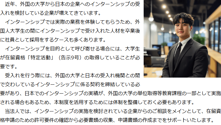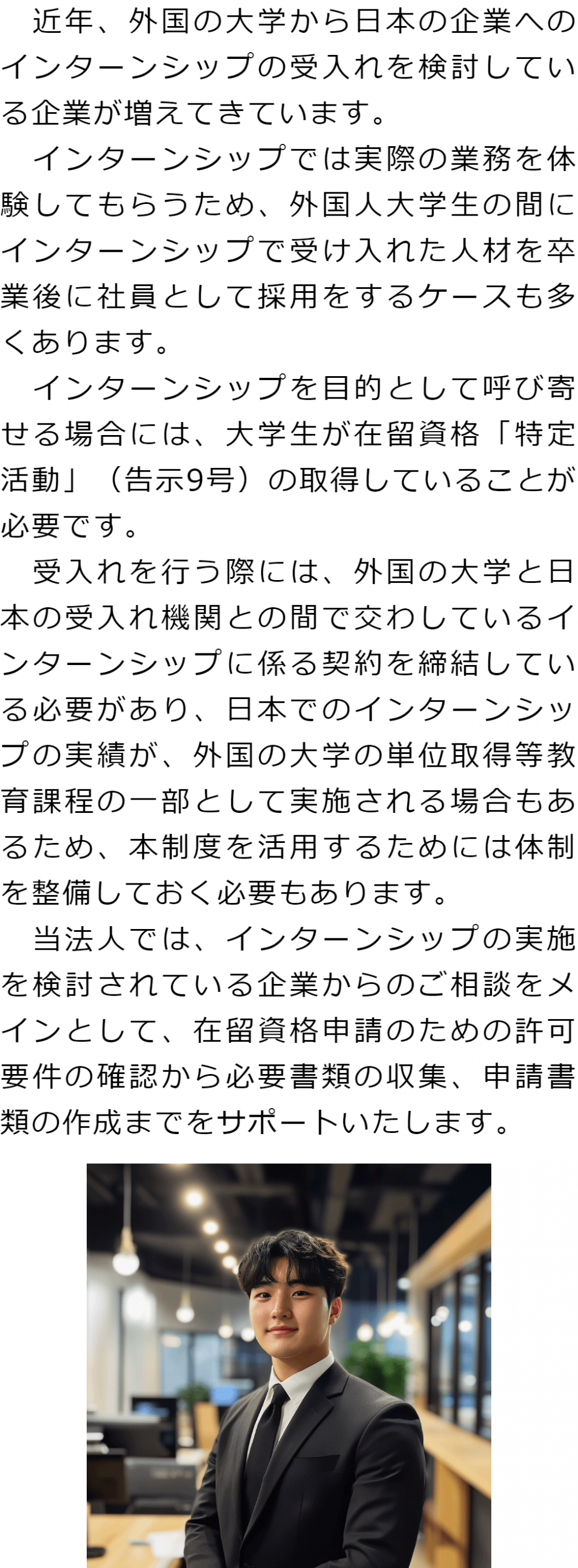 トップビザの種類別サービス内容インターンシップビザ 階層構造▼ ビザの種類別サービス内容(目次) インターンシップビザ ビザの種類別サービス内容(目次)ビザの種類別サービス内容トップ特定技能(就労ビザ)技術・人文知識・国際業務(就労ビザ)就労ビザ(その他)経営管理ビザ国際結婚・配偶者ビザ永住権定住者ビザ家族滞在ビザ短期滞在ビザ帰化申請留学ビザ資格外活動許可インターンシップビザ企業内転勤ビザ高度専門職在留特別許可 受付時間 平日 9時~21時、土日祝 9時~18時 夜間・土日祝の相談も対応します (要予約) 所在地 〒060-0808 北海道札幌市北区北八条西4‐1-1パストラルビルN8 2F 0120-41-2403 お問合せ・アクセス・地図