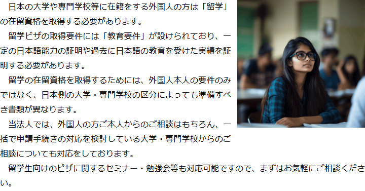 トップビザの種類別サービス内容留学ビザ 階層構造▼ ビザの種類別サービス内容(目次) 留学ビザ ビザの種類別サービス内容(目次)ビザの種類別サービス内容トップ特定技能(就労ビザ)技術・人文知識・国際業務(就労ビザ)就労ビザ(その他)経営管理ビザ国際結婚・配偶者ビザ永住権定住者ビザ家族滞在ビザ短期滞在ビザ帰化申請留学ビザ資格外活動許可インターンシップビザ企業内転勤ビザ高度専門職在留特別許可 受付時間 平日 9時~21時、土日祝 9時~18時 夜間・土日祝の相談も対応します (要予約) 所在地 〒060-0808 北海道札幌市北区北八条西4‐1-1パストラルビルN8 2F 0120-41-2403 お問合せ・アクセス・地図