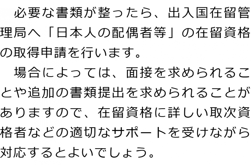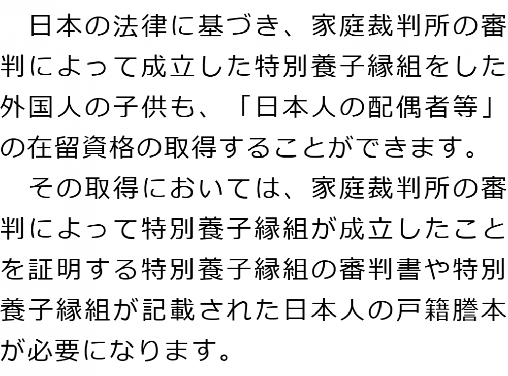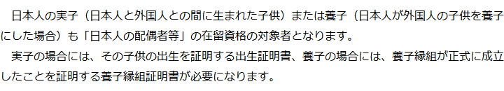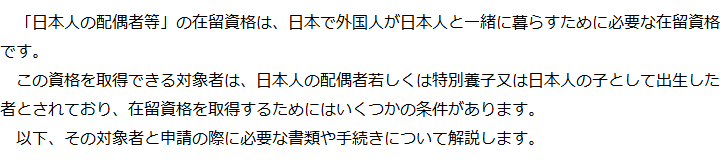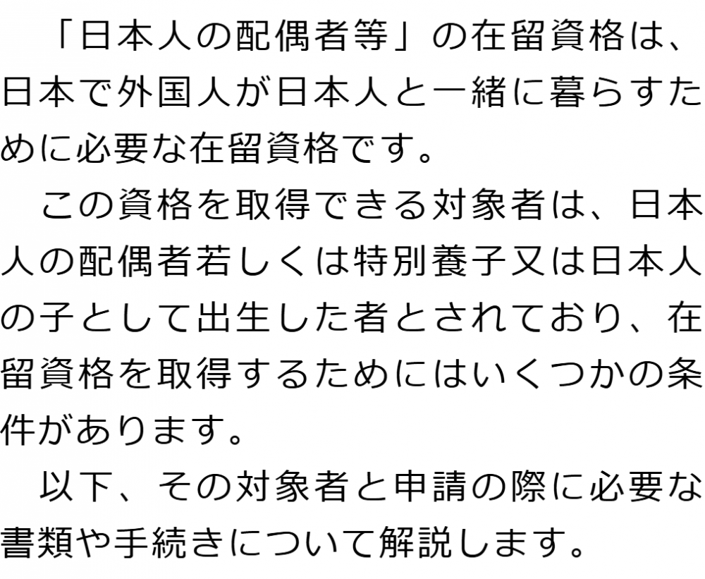 日本人の配偶者等の在留資格の対象者1 「日本人の配偶者等」ビザの対象者2 日本人の配偶者3 日本人の特別養子4 日本人の子供5 申請手続き 1 「日本人の配偶者等」ビザの対象者2 日本人の配偶者3 日本人の特別養子4 日本人の子供5 申請手続き